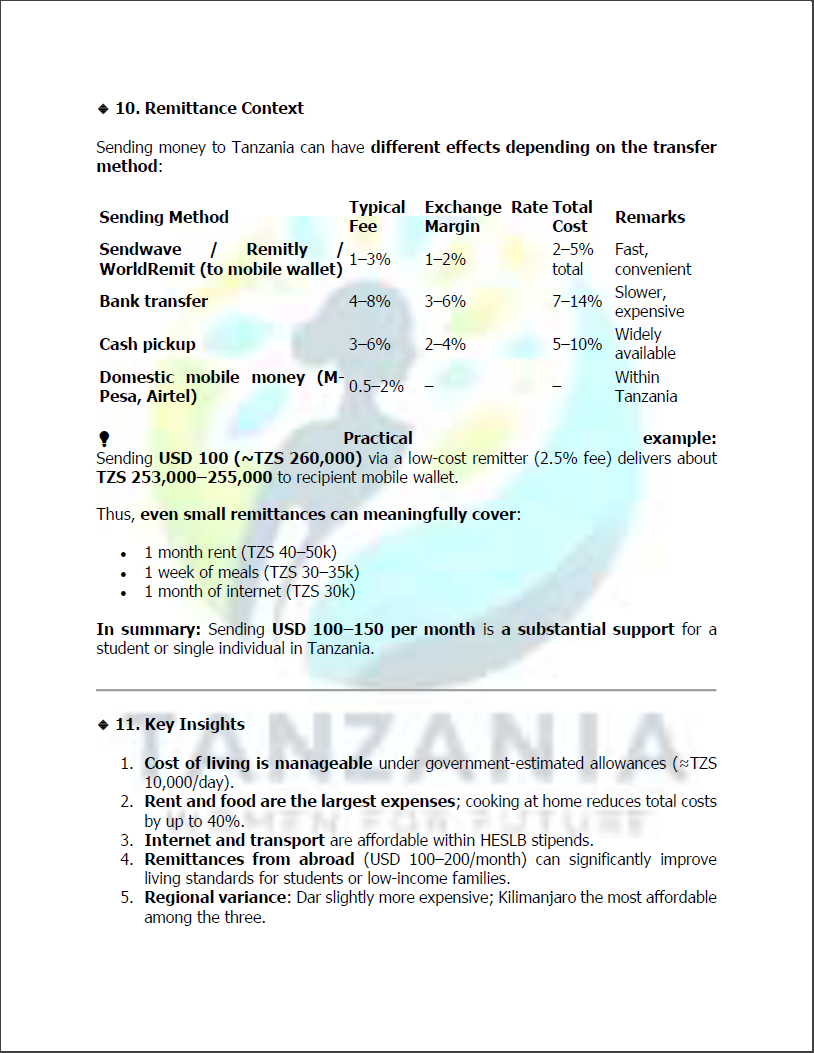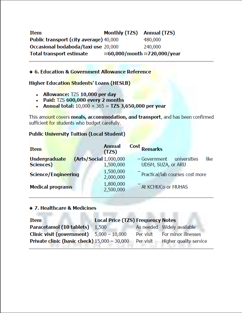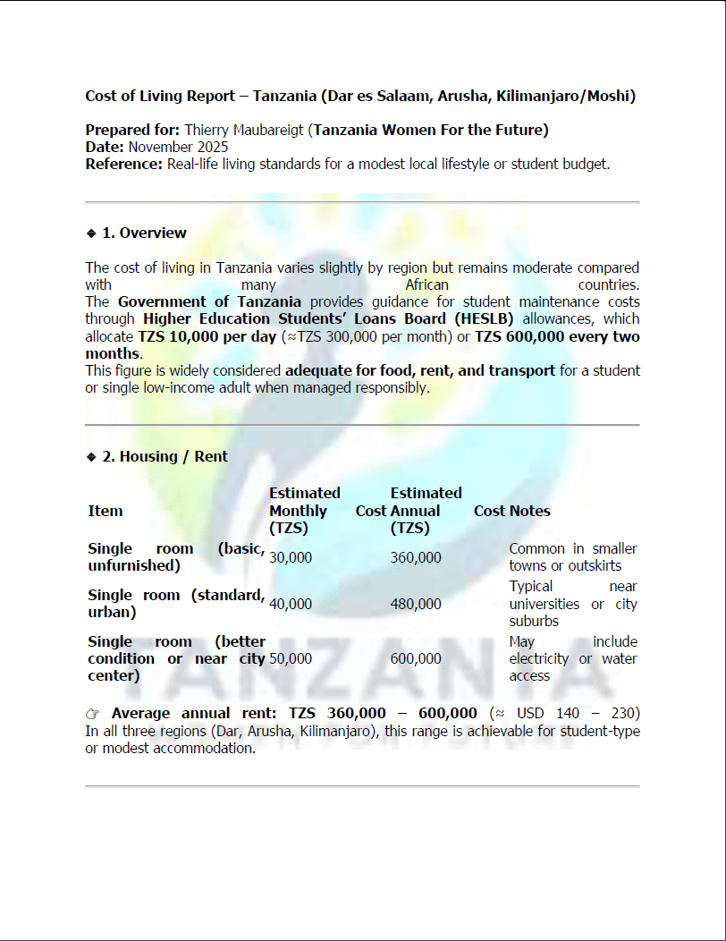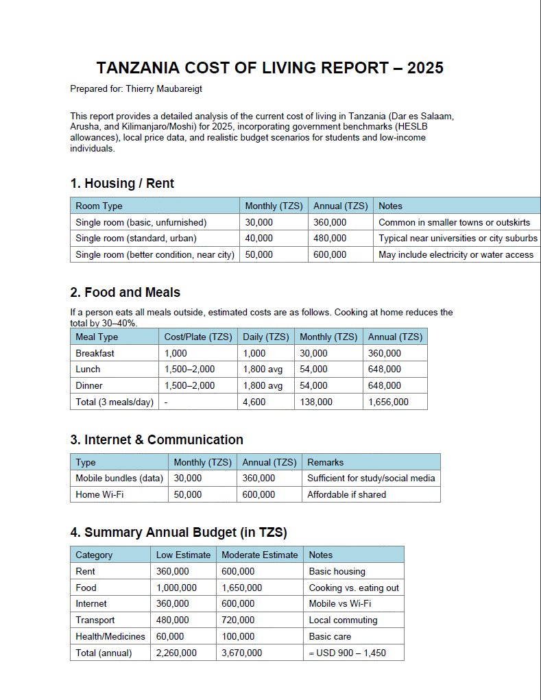 Quelques exemples dans le tableau ci-dessous et rapport détaillé plus bas. Conversion approximative : 10.000 TZS = 3.5 euros